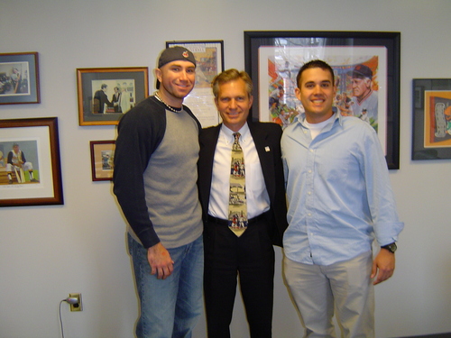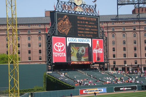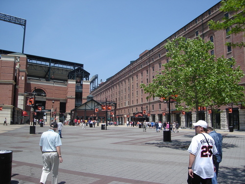 in his Rafael Palmerio Jersey and O’s hat. (That’s him in the picture here, and make sure you check out our Photo Album.) We got to the game a little bit early and were immediately surprised that it was neither raining or windy, in fact it was hot. We entered the stadium on Eutaw street right next to the famous warehouse that only one man to this day has hit, Ken Griffey Jr. Anyways we walked around out thru Eutaw street and if you look to the ground you will notice that there is a plaque on the ground for each homerun hit onto the street. I had Boog’s bbq and was a bit dissapointed. The game was really good we got a chance to see last year’s Cy young of the American league Johan Santana. He allowed a couple of runs and the orioles one it with a BJ Surhoff single in the 8th and then BJ Ryan closed it out. We did not see any homeruns today it was the first game that, that happened. We did see some great defense turned in by The Orioles infield though.